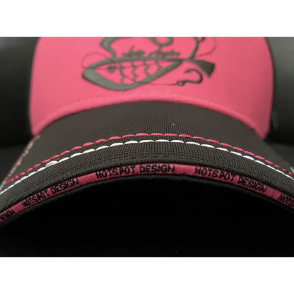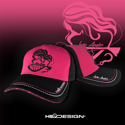 Visor: text Lady Angler and logo Hotspot Design  embroidered, two large sewing lines in white and pink color, sandwich in contrast color with logo Hotspot Design printed in all the length.