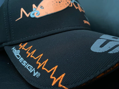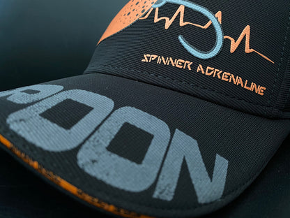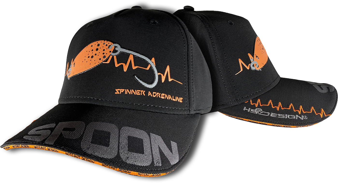 Cap front:  Spoon lure in well evident embossed printing with “adrenaline” lines embroidered on the two sides.