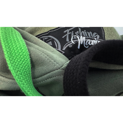 The Carpfishing Mania graphic is well known to our customers, in this restyling our design team selected an attractive green color fabric and used only the outlines of the big carp on the chest obtaining a softer effect but combined with more evident details such as the bright green print, the two-tone cords matched with printing and the three bands hood in contrast color with embossed Carpfishing print.