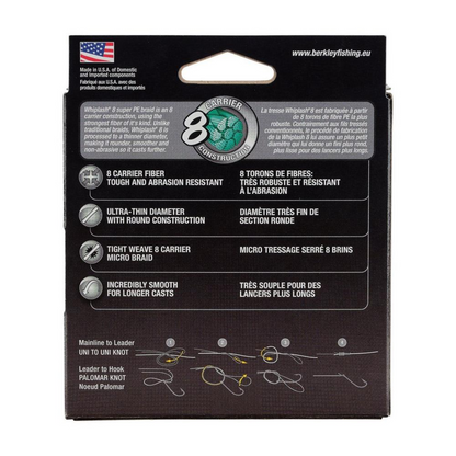 Berkley® Whiplash® 8 is a braided superline made with 100% PE fiber and an 8-carrier construction for a consistent and compact profile. It is designed to handle demanding conditions and large fish, whether in freshwater or saltwater environments.