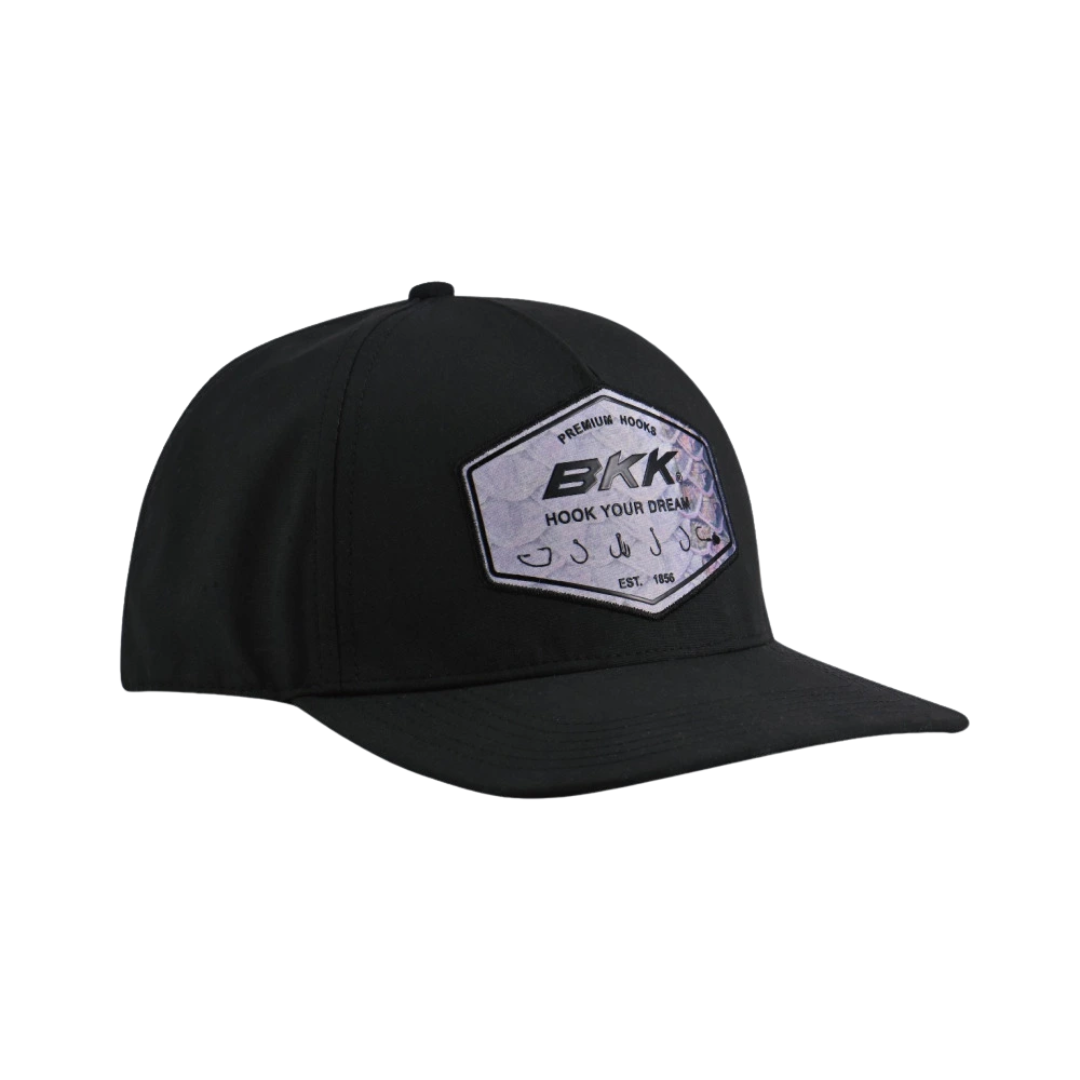 This hat is available in two variations: one featuring the classic BKK logo in black, and the other with the legacy logo over a tarpon-scale pattern.