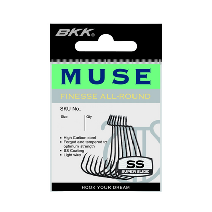 The BKK Muse is a finesse worm hook developed for weed-less presentations of soft plastic baits, making it suitable for targeting fish in heavily pressured waters.