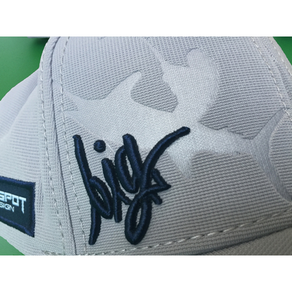 Cap front: text “big” in 3d embroidery, fisherman and HS logo realized by hot press mould for a tone on tone pleasant effect.