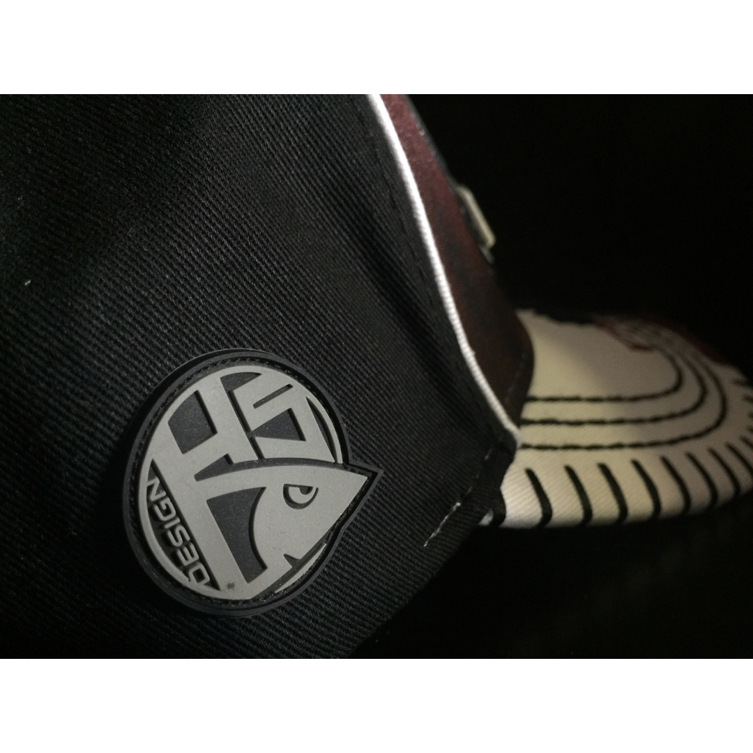 Visor:  in the center of the visor there is a red patch with distressed borders, text “Hotspot” realized in 3d embroidery, text “Fishing Pike” in flat embroidery, visor sewing lines are well visible and realized in contrast color (black sewing lines).